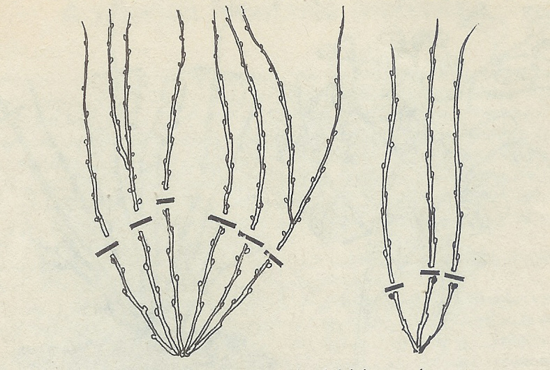 3. A virágok a vesszők oldalán, majd teljes hosszában nyílnak. Sok szép kerti cserje tartozik ide: aranyvessző, a korai nyáriorgona, a rózsalonc, a díszőszibarack és a díszmandula Ezek bokrait közvetlenül az elvirágzás után metsszük. Az elnyílt vesszőket felére, negyedére vágjuk vissza, hogy több erős hajtást hozzon, amelyek jövőre dúsan virágoznak. Ilyenkor távolítsuk el az elöregedett, gyengén virágzó ágakat. Ezeket tőből vágjuk ki. Az erős vízhajtásokat is különböző magasságokban vágjuk el, hogy minél több vessző kihajtására késztessük őket. Ha a május végén, június elején virágzó fajokat csak elnyílás után vágjuk vissza, túlságosan rövid idő marad az erőteljes új hajtások kifejlődésére. Ezért ajánlatos, főleg ott, ahol sovány a talaj és az öntözés sem megoldott, az elöregedett ágak és az erőteljes vesszők egy részét még a lombfakadás előtt az előbb elmondottak szerint visszametszeni.