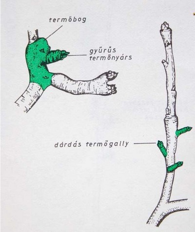 Dárdás termőgally – a sima termőnyárs elágazódásakor keletkezik.Gyűrűs termőnyárs – nevét a nyárs kerületén visszamaradó levélripacsok gyűrűszerű elrendezésétől kapta