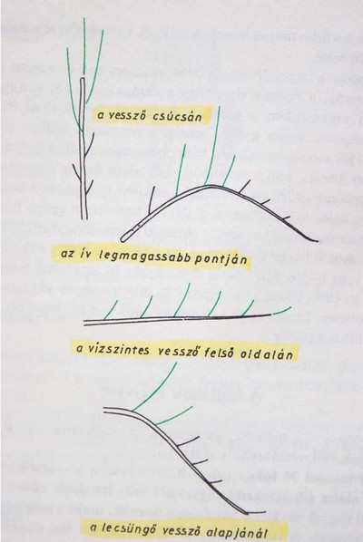 A vessző minél közelebb helyezkedik el a vízszinteshez, vagy hajlik az alá, annál jobban berakódik termőrügyekkel és csökken a növekedési hajlama.