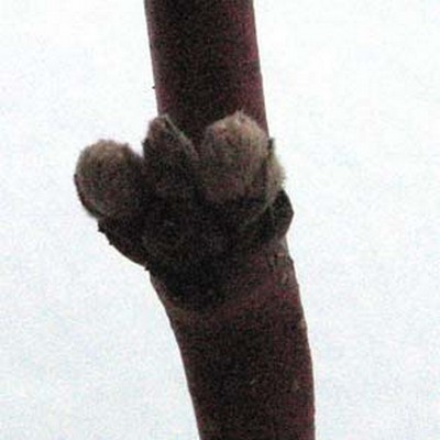 7. kép Az őszibarack teljes termőveszzőire jellemző hármas rügycsoport, aminek a középső rügye hajtórügy, a két szélső rügye termőrügy.