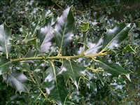 Ilex aquifolium: nagy bokor, vagy kis fa. Az atlanti vidékről származik, ezért védett, párás környezetet igényel. Ilyen helyen szépen fejlődik, sokat terem. Sok tarka levelű fajtája ismert, ezek igényesebbek. A kereskedelemben sok fajtát kínálnak. Kétlaki növények, ezért a nőnemű egyedek mellé hím neműeket is kell ültetni, hogy termést lássunk.