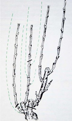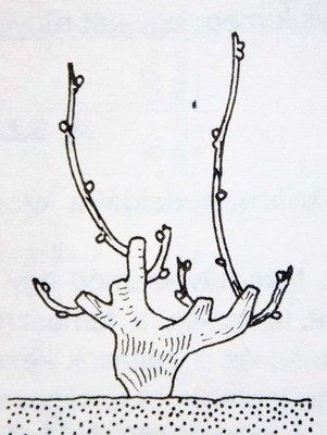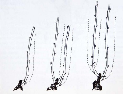 2. kép: A rövidcsapos metszés változatai: az egyrügyes, a kétrügyes, és a kétrügyes egyrügyes ugarcsappal.
