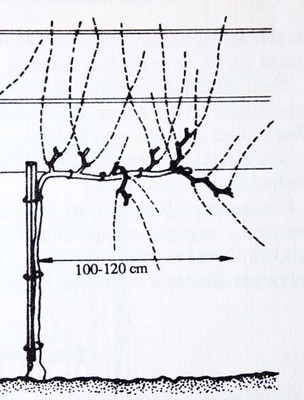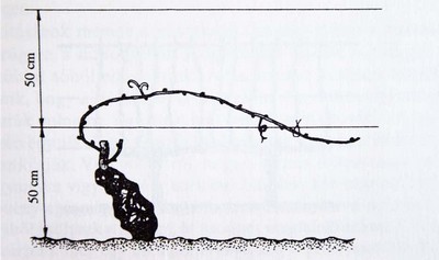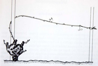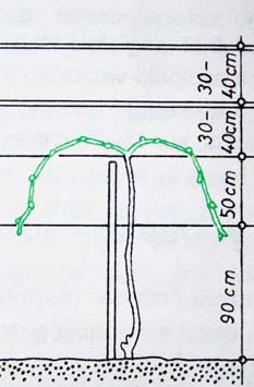 3. Sylvoz művelés: A Sylvoz művelésű tőkéken nem folytatunk váltómetszést, csak 3-4 szálvesszőt hagyunk meg, és azt leíveljük és lekötözzük az erre a célra kifeszített segédhuzalhoz. Az erős ívelés következtében nem érvényesül a csúcsdominancia, és minden rügy kihajt. Itt a törzsmagasság 120-160 cm, a segédhuzal 40 cm-re a kartartó huzal alatt van, a hajtástartó huzal pár 40-50 cm-re a kartartó huzal felett helyezkedik el. Az alacsonyabb törzsmagasságnál két hajtástartó huzalpár is kifeszíthető, mert még így sem lesz túl magas a sor, nem árnyékolja le a mellette lévő sort és a nagyobb lombfelület hagyható, ami elősegíti a fürtök fejlődését. A tőtávolság itt is 120 cm, a sortávolság minimum 3,5 méter, hogy a gép kényelmesen tudjon a sorok között közlekedni.