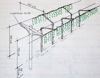 6. A kettősfüggöny művelés: A kettősfüggönyű művelésnél két teljesen különálló lombfalat nevelünk. Metszése megegyezik az egyes függönyével. A gépi szüret itt könnyebben megoldható, mert a gépet nem zavarja a támaszrendszer. A tőtávolság itt is 120 cm, de a sortávolság minimum 4,5 méter. A támaszrendszert és a művelésmódot a 13. kép szemlélteti.