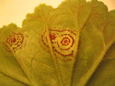 Csak az álló muskátlin fordul elő. Hazánkban ez a gomba szabadföldön nem képes áttelelni. Többnyire teleltetőben megfertőződött és kitárolt növényeken illetve az itt szedett dugványok fertőződhetnek, illetve fertőzhetnek tovább. A levelek színén 5-8 mm nagyságú, sárga foltok láthatók, míg a fonákán koncentrikus körben sorakoznak a szóruszok (szaporítóképletek). Idővel a beteg foltok összefolynak, a levél elszárad, a növény felkopaszodik, díszítő értéke elveszik, virághozama minimális lesz. A beteg muskátli leveleket le kell szedni. A fertőzés korai megállapítása érdekében a növényeket folyamatosan ellenőrizzük.